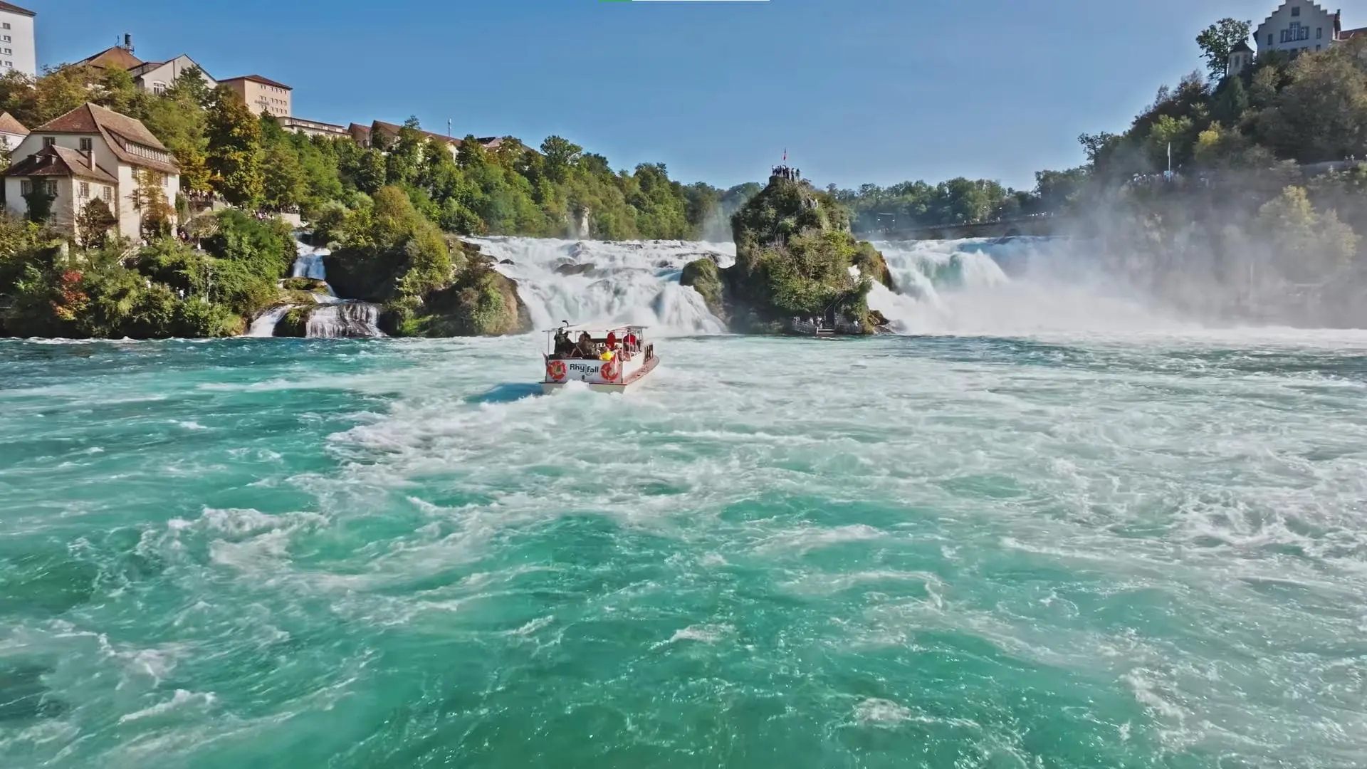Rhine Falls is Europe’s biggest and most spectacular falls. The Rhine Falls have a drop of around 23 metres but are 150 metres wide making this a very large and impressive sight